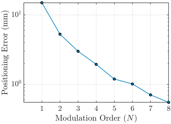 Figure 14 illustrates the effect of modulation order on VLP accuracy. As N increases, the positioning error steadily reduces. This trend indicates that high-order NMSK modulation significantly enhances tracking performance in environments requiring precise localization. The decreasing error with higher N values also supports the feasibility of using NMSK for applications like indoor navigation and autonomous systems, where accurate positioning is crucial. This improvement in positioning accuracy, even with a slight BER trade-off, makes high-order NMSK a promising candidate for dynamic and dense positioning environments.