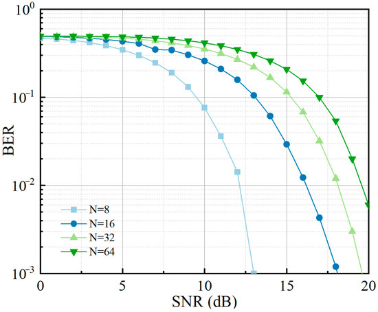 To further validate the reliability of high-order NMSK in practical scenarios, we simulated the BER performance under realistic channel impairments in Figure 15, including multipath fading and additive white Gaussian noise. The results show that higher-order NMSK maintains a reasonable error level as the SNR increases, ensuring basic communication quality. As depicted in Figure 14, despite this BER performance, the positioning error steadily reduces with increasing N. This confirms that high-order NMSK achieves a good balance between communication reliability and positioning accuracy in dynamic and dense environments, reinforcing its viability for applications like indoor navigation and autonomous systems, where accurate positioning is crucial.