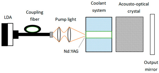 A high-peak-power, narrow-pulse Q-switched Nd:YAG laser was used as a model to analyze the impact of lower-level particles on the laser pulse waveform through simulations. The simulation model is shown in Figure 1, which features a linear cavity with an end-pumped laser diode (LD) and an integrated Q-switched system.