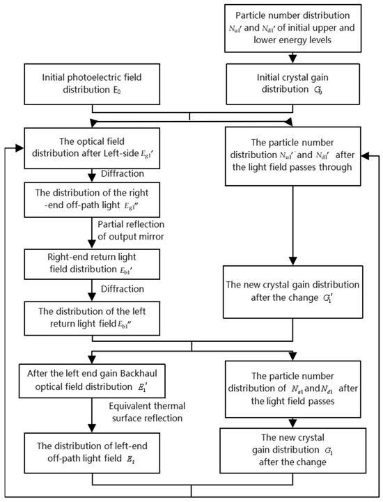 The numerical calculation methods are employed to solve the rate equations, using the duration of single-pass photon transmission in the resonant cavity as the time step. Each single-pass transmission corresponds to one iteration. For convenience, this algorithm is referred to as the lower-energy-level algorithm (LELA). The flowchart of the algorithm is presented in Figure 2. The specific calculation steps are described as follows: