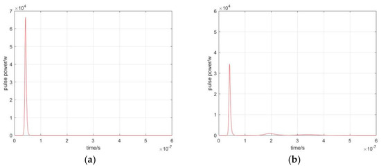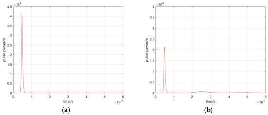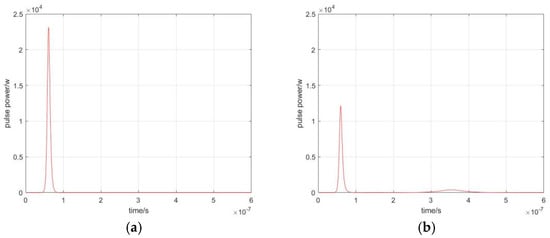 It is clear from Figure 6 that the experimental results are consistent with the simulation results obtained using LELA. After the main pulse ends, a distinct sub-pulse appears, with its peak power significantly lower than that of the main pulse, and its pulse width is several times that of the main pulse; the time interval between the main pulse and the sub-pulse is also relatively similar, at around 80–100 ns. By contrast, NLELA does not exhibit this sub-pulse phenomenon.