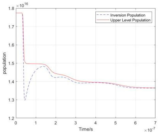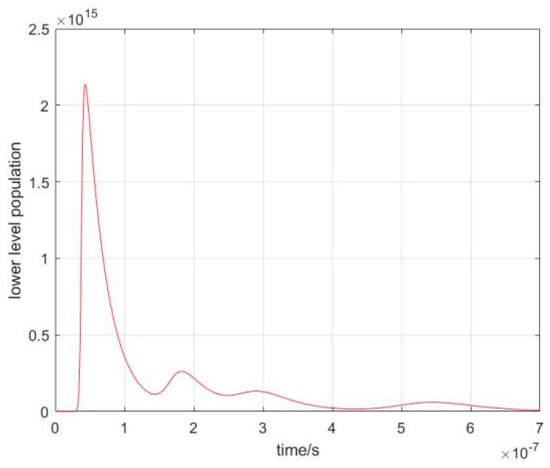 It is clear from Figure 7 and Figure 9 that the peak value of the lower-level particle population is approximately 2.1 × 1015, which is an order of magnitude smaller than the maximum value of the inversion particle population of 1.78 × 1016. In addition, the spontaneous emission time of the lower level is relatively short (around 30 ns), making the change in the number of inversion particles caused by spontaneous emission sufficient to generate a new pulse.