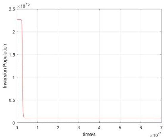 Figure 7 illustrates the variation trends of the upper-level particle population and the inversion particle population in LELA at a pump power of 100 W. Figure 8 shows the variation trend of the inversion particle population in NLELA at the same pump power. Compared with NLELA, where the number of inversion particles decreases in a single obvious step-like manner, LELA exhibits multiple step-like decreases. This multiple step-like decrease in the number of inversion particles leads to the appearance of multiple pulses in the laser output.