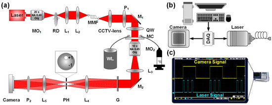 The detailed optical path setup is shown in Figure 2a. The imaging system has been modified from the one used in our previous studies [12,37]. The light is focused through a rotating ground glass (RD) diffuser onto a multimode fiber to generate dynamically scattered light. This dynamically scattered light acquires partially coherent light characteristics after being time-averaged. The dynamic speckle pattern on the ground glass is imaged by a telescope system onto the end face of the multimode fiber and coupled into the fiber. Following transmission through the fiber, the output light at the distal end is collimated by a CCTV lens, thereby generating partially coherent illumination (PCI) for PM-DHM. Polarizer 1 is positioned in the illumination path to modulate the light into a horizontally polarized state. The polarized illumination then passes through a quarter-wave plate before irradiating the specimen under test. The specimen is placed at the front focal plane of a telescope system composed of microscope objective 2 and lens 3, where an amplified real image is formed at the system’s back focal plane. A polarization grating positioned at this image plane diffractively splits the object wave into multiple beams propagating along the 0th, +1st, and −1st diffraction orders. At the back focal plane of lens 4, the +1st order diffracted beam passes through a large aperture in the spatial filter (preserving its spectral integrity) to serve as the object wave O(x, y). Meanwhile, the −1st order beam undergoes pinhole spatial filtering via lens 5, transforming into a collimated plane wave devoid of specimen information to function as the reference wave R(x, y). The object beam and reference beam eventually create an interference pattern on the CCD plane. In the optical path, since both the object and reference beams pass through exactly the same optical components, the impact of environmental vibrations on the system is minimal. This method uses a polarization grating to split the light through diffraction. By changing the polarization state of the incident light, the relative intensity between the object and reference beams can be adjusted, ensuring that the fringe contrast of the hologram reaches its maximum. The partially coherent light field generated by the rotating ground glass and multimode fiber effectively suppresses coherent noise in phase imaging, significantly improving the imaging signal-to-noise ratio. The microfluidic chip (MC) used in the experiments has channel dimensions of approximately 1.3 mm in width and 120 µm in height. By applying external pressure from the syringe, the particles are propelled through the microfluidic channel and into the waste liquid vial (WL). It is important to note that to achieve pulsed modulated illumination, the original system laser was replaced with a digitally modulated laser (FC-405/488/635-1.1W(EF60054), Changchun New Industry, Changchun, China). It is a continuous wave laser operating at a wavelength of 635 nm, with a maximum output power of 500 mW. Additionally, to synchronize the timing control of the laser and camera, a Data Acquisition (DAQ) device (DAQ-USB 6212, Austin, NI, USA) was integrated into the system as a control unit, as shown in Figure 2b. The pulsed modulated laser flashing is digitally governed by the external trigger signal in the form of TTL signals from the DAQ. The duty cycle, defined by the high-level and low-level times, can be set freely. LabVIEW was used to control the DAQ and to generate timing signals to synchronize the control system across all of the instruments. Specifically, the DAQ generated TTL signals with different high-level and low-level times to control the laser’s illumination and closure times as well as the camera’s external trigger acquisition. During the single-frame exposure time, the laser was modulated multiple times to generate laser pulses with the on-time ton and the off-time toff. Moreover, it is important to emphasize that during actual experiments, a global exposure mode of the camera is strongly recommended for better synchronization of the illumination and exposure. For this purpose, we used a CMOS camera (Mars8000S-46UM, Vision Datum, Hangzhou, China) operating in global exposure mode. Figure 2c illustrates the time relationship between camera exposure and pulsed modulated illumination as displayed on the oscilloscope.