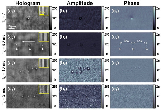 To demonstrate the feasibility of the PM-DHM system for measuring flowing particles, 5-µm PMMA microspheres were suspended in pure water and then introduced into a microfluidic channel. PMMA microspheres are spherical particles fabricated from polymethyl methacrylate, an amorphous thermoplastic polymer material [41]. Figure 3 presents (a) digital holograms (b) reconstructed amplitude, and (c) phase images of PMMA microspheres. The illustration in the upper right corner of each hologram shows the magnified interference fringes of the object and reference light. It enables a clearer observation of the interference fringe’s clarity and contrast, which reflects the quality of the hologram. The phase images reflect the thickness of the particles and clearly depict the morphology of the PMMA microspheres. The field of view of all of the images is 76.8 × 43.2 mm2. The subscript “1” in the figure labels, i.e., Figure 3(a1–c1), indicates that the images are of a single static PMMA microsphere under non-pulse modulation. The camera’s exposure time is 10 ms. From Figure 3(c1), we can clearly observe the spherical morphology of PMMA.