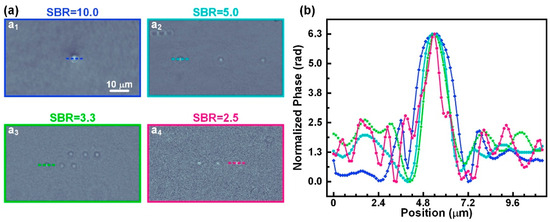 Four profile lines across the center of the microspheres have been extracted, and the normalized phase is displayed in Figure 4. Subsequently, the signal-to-background ratio (SBR) was calculated by dividing the peak of the curve (signal) by the plateau of the curve (background). The comparison suggests that shorter pulses result in higher noise levels. It was found that the SBR decreases from 10.0 to 2.5 as the illumination time decreases from 10 ms to 0.02 ms. Therefore, a compromise between time resolution and SBR must be established for a given laser power in PM-DHM.