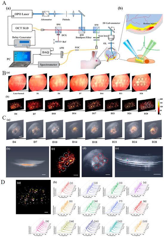 - Tian, C.; Zhang, W.; Mordovanakis, A.; Wang, X.; Paulus, Y.M. Noninvasive chorioretinal imaging in living rabbits using integrated photoacoustic microscopy and optical coherence tomography. Opt. Express 2017, 25, 15947–15955. [Google Scholar] [CrossRef]