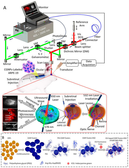 Custom-built photoacoustic microscope (PAM), OCT, and fluorescence multimodality imaging system, stem cell transplantation procedure, and synthesis procedure of functionalized chainlike gold nanoparticle clusters: (A) Schematic diagram of the imaging system and in vivo experiment protocol. Green laser photocoagulation was carried out to induce RPE and retinal injury. Then, multimodality PAM and OCT imaging were used to monitor the labeled ARPE-19 cells injected into the subretinal space for 90 days postinjection. Two different excitation wavelengths of 578 and 650 nm were applied to acquire PAM images. (B) Schematic diagram of ICG@CGNP cluster–RGD synthesis. Adapted with permission from [68]. Copyright {2024} American Chemical Society.