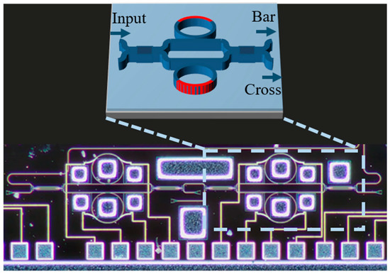 where denotes the electric field response at the input port and represent the electric field responses at the “bar”/“cross” output ports, respectively. The parameters and are the coupling and transmission coefficients of the 2 × 2 MMI. For an ideal 50:50 MMI splitter, . The transfer function of the MRR and MZI coupling arms are ( = 1, 2, 3, and 4).