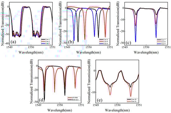 The experimental results of tuning the center wavelength, bandwidth, out-of-band suppression, and filtering shape of the fourth-order IIR optical filter are presented in Figure 2. This tuning was achieved by controlling the phase shifter on the IIR filter micro-ring. The transmitted spectra with tunable optical bandwidths are illustrated in Figure 2a. Case 1, Case 2, and Case 3 exhibit 3 dB bandwidths of 0.32 nm, 0.365 nm, and 0.395 nm, respectively, indicating that the maximum variation in the 3 dB bandwidth is approximately 0.075 nm. Figure 2b depicts the transmitted spectra with a tunable center wavelength. The tuning range of the center wavelength can cover the entire FSR. Figure 2c presents the transmitted spectra with a tunable out-of-band suppression ratio. Case 7, Case 8, and Case 9 demonstrate suppression ratios of 6 dB, 14 dB, and 25 dB, respectively, indicating a tuning range of 19 dB. The spectra depicted in Figure 2d show that the wavelength spacings between two adjacent dip peaks within a single FSR of the red curve are approximately half of the black curve. The device is reconfigured into two filters with different FSRs. Figure 2e depicts the two filtered spectra with relatively smooth roll-offs, suitable for pre-equalization.