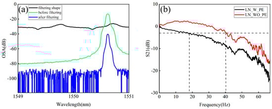 The experimental setup is shown in Figure 3. We use a vector network analyzer (VNA) (Keysight PNA-X Network Analyzer, Keysight Technologies, Santa Rosa, CA, USA) and a LiNbO3 Mach–Zehnder modulator (MZM) with a 3 dB bandwidth of 20 GHz to estimate the frequency equalization properties of the on-chip filter, as shown in Figure 3a. S parameters are collected with and without the filter. In Figure 3b, the output of a continuous-wave (CW) laser (Santec Tunable Semiconductor Laser TSL-570, Santec Corporation, Aichi, Japan) is modulated by the LiNbO3 MZM using the outputs of a binary pattern generator (BPG) (SHF 12104 A Bit Pattern Generator, SHF Communication Technologies AG, Berlin, Germany), which provides various long pseudo-random binary sequences (PRBSs). The OOK signal at the output of the MZM passes through the optical pre-emphasis filter and is then amplified by an optical fiber amplifier (EDFA) (Amonics AEDFA-PA-35-B-FA, SHF Communication Technologies AG, Berlin, Germany). We record the signals using a digital sampling oscilloscope and perform offline signal analysis. Placing an optical filter after the modulator can extend the transmitter bandwidth by adjusting the spectral response around the carrier wavelength, which effectively constructs an inverse system to pre-compensate for the roll-off of the modulator frequency response.