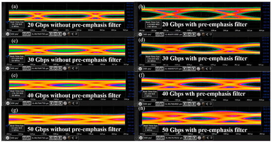Eye diagram measurement results: (a,c,e,g) show the eye diagrams of OOK signals at 20 Gbps, 30 Gbps, 40 Gbps, and 50 Gbps without IIR pre-emphasis, respectively; (b,d,f,h) show the eye diagrams of OOK signals at 20 Gbps, 30 Gbps, 40 Gbps, and 50 Gbps with IIR pre-emphasis, respectively.