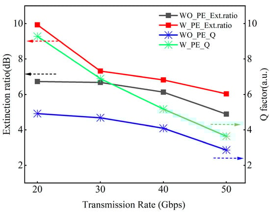 In order to investigate the effect of the introduced on-chip optical IIR filter on signals with different data rates, the eye diagrams of OOK signals at data rates of 20, 30, 40, and 50 Gbps are measured. The same study is also conducted for the input OOK optical signal without optical pre-emphasis. As can be seen in Figure 5, a clearer eye diagram is obtained and the signal distortion is suppressed. It can also be observed that the signal quality is improved due to optical IIR pre-emphasis. To further evaluate the performance of the method used, Figure 6 quantifies this improvement, showing the extinction ratio and Q-factor analysis of the eye diagram. The effect is particularly significant at low transmission rates. At a transmission rate of 20 Gbps, the OOK signal demonstrates a significant improvement in extinction ratio of approximately 3.2 dB, while the Q factor of the eye diagram increases by approximately 4.36. At a data rate of 30 Gbps, the extinction ratio of the OOK signal is improved by nearly 0.64 dB and the Q factor of the eye diagram is increased by about 2.21. At 40 Gbps, the extinction ratio increases by approximately 0.69 dB and the Q factor rises by about 1.08. At 50 Gbps, the extinction ratio improves by about 1.14 dB, with the Q factor increasing by nearly 0.78. These results collectively demonstrate the effectiveness of the proposed approach across a wide range of data rates.