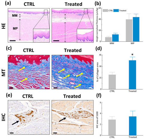 The treated group demonstrated notable thickening of the muscularis mucosa (MM) and muscularis propria (MP) relative to the CTRL, with observed increases of 85% and 21%, respectively (310 µm/kg in CTRL vs. 574 µm/kg in treated for MM; 1628 µm/kg in CTRL vs. 1972 µm/kg in treated for MP; note that thickness was normalized to weight).