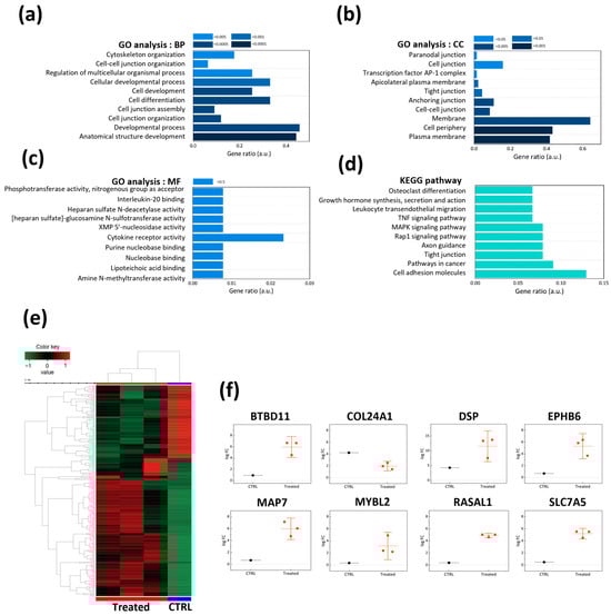 Figure 3 illustrates both the genetic and biological functional changes through RNA-sequencing pathway analysis between the CTRL and treated groups. Information on the expression levels of 14,875 genes in the extracted esophagus tissue was obtained using the HISAT2 program. The results of the GO terms associated with the DEGs in the CTRL and treated esophagi were identified as enriched, encompassing the categories of biological process (BP), cellular component (CC), and molecular function (MF) (
