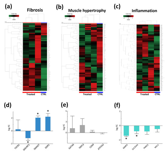 Figure 4 shows the gene expression differences related to fibrosis, muscle hypertrophy, and inflammation response between CTRL and treated groups, as confirmed by GO and KEGG analysis. In