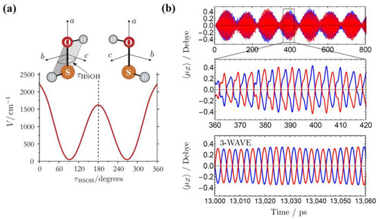 (a) Torsional PES of HSOH along τHSOH with enantiomer abc frames. (b) Time evolution of (μZ) for enantiomers ψL (blue) and ψR (red) under double-pulse excitation (6 ps delay, 45° polarization). Bottom: Three-wave simulation using three-level transition system [52].