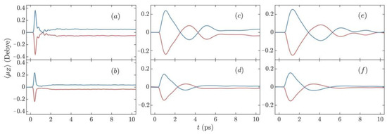 Enantiomer-specific ⟨μz⟩ vs. time under double-pulse excitation: (a,b) HSOH at (a) 0 K (t = 0.32 ps) and (b) 50 K (t = 0.27 ps). (c,d) PPO at (c) 0 K (t = 0.45 ps) and (d) 50 K (t = 0.38 ps). (e,f) Ethyl oxirane molecule (EtOx) at (e) 0 K (t = 0.60 ps) and (f) 50 K (t = 0.50 ps). (Blue/red: enantiomer pairs) [55].