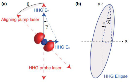 Molecular alignment also enhances the polarization properties of HHG beyond conventional limits. In 2009, Zhou et al. [61] experimentally established that linearly polarized laser-driven aligned N2 molecules emit elliptically polarized harmonics with ellipticity up to 0.35 (21st harmonic order). This arises from alignment-induced anisotropy in the recombination dipole moment. Deviations of the molecular axis from the laser polarization direction generate a phase difference (Δϕ) between the parallel and perpendicular dipole components, leading to elliptical polarization, as seen in Figure 5. Further theoretical work [62] demonstrated that the polarization states of harmonics from aligned N2, CO2, and O2 can be accurately predicted using the quantitative rescattering (QRS) model, with ellipticity dictated by Δϕ and alignment distributions.