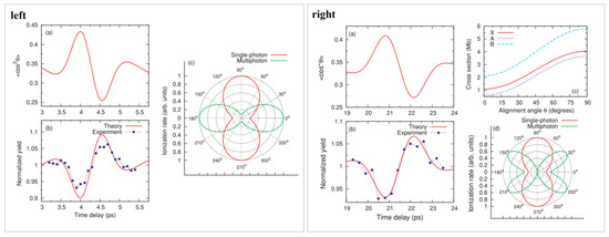 For polar molecules, the interaction between their permanent dipole moment and a large static electric field (>50 kV/cm) creates “pendular states”, permitting brute-force orientation of molecular ensembles [65]. Li et al. selected pyridazine as a model system due to its strong permanent dipole moment (4 Debye) in the ground state and rotationally resolved ultraviolet absorption spectra, which permitted the simultaneous determination of the supersonic beam’s rotational temperature (2 K) [65]. Their experiments demonstrated a 40% enhancement in ionization efficiency when the resonant laser polarization was switched from parallel to perpendicular relative to the alignment field, confirming the alignment-dependent matching between the transition dipole moment (perpendicular to the molecular axis) and laser polarization. Furthermore, the association between molecular alignment and ionization cross-sections has been verified in polyatomic systems [67,68]. Transiently aligned N2 and CO2 displayed distinct anisotropy in single-photon ionization: N2 showed the greatest ionization when aligned perpendicular to the laser polarization (Figure 7c, left panel), and despite the different orbital symmetries (σg for N2 vs. πg for CO2), CO2 also displayed maximum ionization in the perpendicular alignment (Figure 7d, right panel). This shared perpendicular preference arises because the transition dipole orientations (perpendicular to the molecular axis) and the symmetry of high-energy continuum states dominate the ionization dynamics, overriding the initial orbital symmetry differences. Theoretical simulations suggest that molecular alignment modifies angular channel-specific cross-sections (e.g., Σ vs. Π transitions), thus defining the macroscopic PAD properties [67,69].