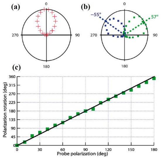 Filament-induced birefringence (λ/2-plate equivalence) in 3-bar Ar. (a,b) Transmitted intensity polar plots (half-pattern shown): (a) filament polarization: 0°; (b) probe polarization rotation: −55°→57° (Δ112°) via co-propagation. (c) Experimental probe rotation (dots) matches ideal λ/2-plate behavior (line) [76].