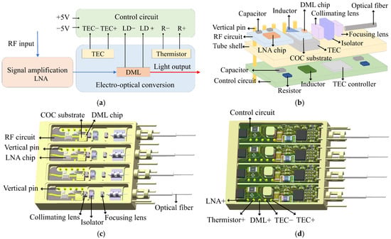 The four-channel high-gain integrated optical emission module is mainly composed of three core parts, including the signal amplification section, the control circuit, and the electro-optical conversion section, as shown in Figure 1a. The signal amplification section inputs the received RF signal into an LNA chip to amplify the signal. The control circuit includes temperature control to ensure the proper working environment for the optical chips. The electro-optical conversion section converts the RF signal into an optical signal through a DML chip and transmits the optical signal to the external part of the module using an optical fiber.