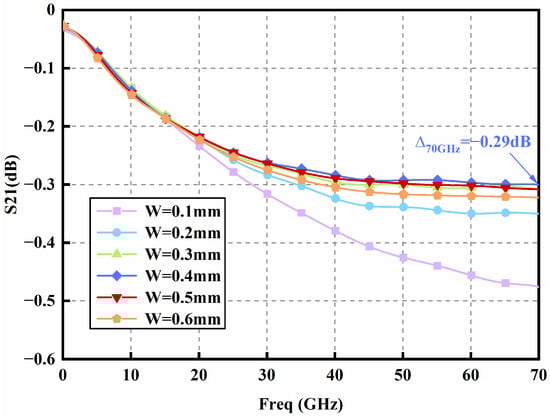 The RF circuit adopts the structure of a microstrip line. The substrate material is Rogers RT5880 with a dielectric constant of 2.2 and a dielectric loss of only 0.0009, making it ideal for high frequency applications. The design size of the substrate is 7 mm × 4 mm × 0.13 mm. We studied the effect of the signal line width W on the transmission performance, as shown in Figure 3. The results show that the transmission performance of the line is the best when the signal line width W is 0.4 mm. In the range of 0∼70 GHz, the transmission loss of the RF circuit is less than 0.3 dB, which is far enough to meet the application requirements of the module.