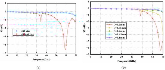 Effect of (a) the vias and (b) the distance D between the vias on the transmission performance.