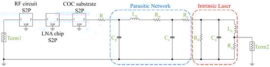 To evaluate the effect of LNA on the gain of the module, we modelled the RF signal transmission equivalent circuit of the optical emission module. As shown in Figure 5, the intrinsic circuit of the laser is based on the rate equation. Ca and La represent the storage effects of carriers and photons in the active region, respectively. Ra and Rd are used to simulate the relaxation oscillation damping of the laser. The parasitic network mainly includes the chip parasitic network and the package parasitic network. The chip parasitic network is the contact capacitance and series resistance of the active region and the chip electrode, which are represented by Cc and Rc, respectively. The package parasitic network is the parasitic capacitance, inductance, and resistance introduced by the carrier and the gold wire in the package, which are represented by Cp, Lp, and Rp, respectively. The equivalent circuit also includes a series matching resistor R and S2P models of the COC substrate, LNA chip, and RF circuit.