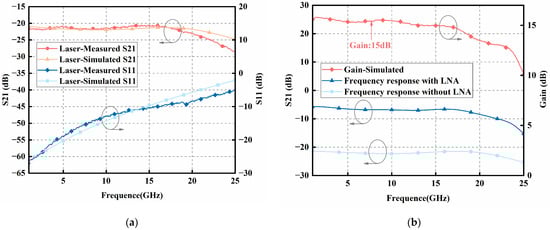Firstly, the equivalent circuit model containing only the laser intrinsic circuit, parasitic network, and the series matching resistor R was simulated. To extract the parameter values in the model, the transmission curve of the DML was measured using a vector network analyzer (VNA), and the model was fitted, as shown in Figure 6a. The S21 curve represents the transmission loss, and the S11 curve represents the return loss. The measurement results of S21 and S11 are consistent with the simulation results, which initially ensures the accuracy of the laser model. The specific component parameters are shown in Table 1. Finally, the complete equivalent circuit model of optical emission module was simulated, as shown in Figure 6b. In the range of 0.8~25 GHz, the gain is approximately 15 dB. Based on the above analysis, results show that the integration of the LNA chip and the DML chip in the optical emission module can effectively improve the signal gain.