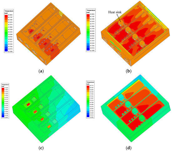 Thermal distributions at 25 °C. Heat sink scheme: (a) front side and (b) back side. Microchannel scheme: (c) front side and (d) back side.
