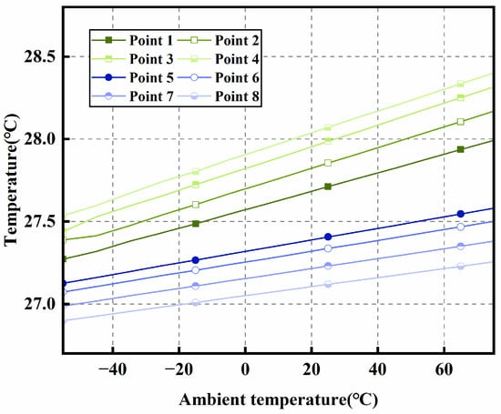 Based on the microchannel liquid cooling solution, the module’s thermal performance was simulated across a wide temperature range of −55 °C to 75 °C. Multiple monitoring points were selected on the module during simulation, with the coolant temperature additionally maintained at 25 °C. As shown in Figure 9, the module consistently maintains its temperature below 30 °C, demonstrating the cooling structure’s high efficiency and its ability to enhance module reliability.