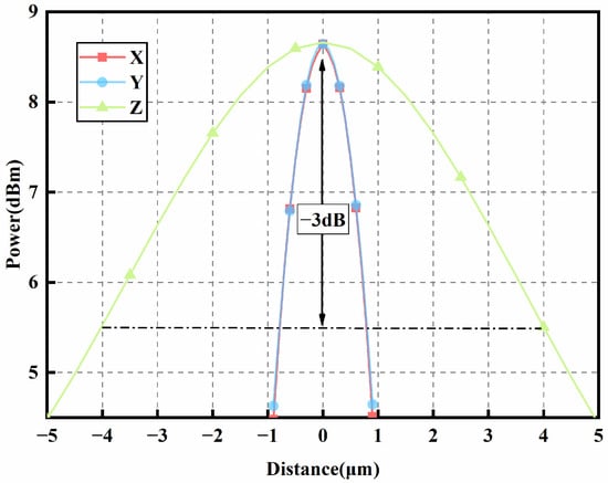 To provide a theoretical basis for practical coupling processes, simulations were conducted to determine the 3 dB tolerance ranges in the X, Y, and Z directions during coupling. These ranges correspond to the allowable displacement limits of the light source before the coupled power drops by 3 dB, as shown in Figure 11. The results indicate that the tolerance ranges are approximately ±0.8 μm in the X and Y directions and ±4 μm in the Z direction.