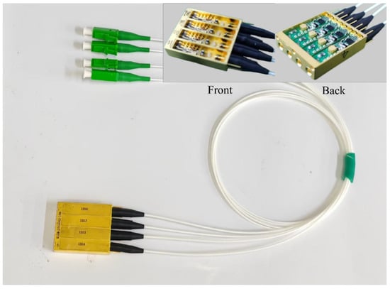 Figure 1c,d show the configuration of the optical emission module. On the front side of the package, the vertical pins and the electrodes of the chip or device are connected by gold wire bonding. On the back side of the package, the vertical pins are connected to the control circuit board by solder. As shown in Figure 1d, the vertical pins from left to right function as follows: voltage supply for the LNA chip, current injection for the thermistor, bias current supply for the DML chip, current path for the negative TEC terminal, and current path for the positive TEC terminal. The design size of the four-channel optical emission module is 24.4 mm × 21 mm × 5.9 mm.