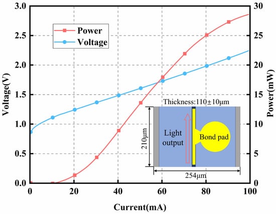 The DML chip is a commercial distributed-feedback (DFB) edge-emitting laser chip based on InP. The laser design adopts a ridge waveguide structure with a multi-quantum well (MQW) active layer and a DFB grating layer. The L-I-V curve and the schematic of the DML are shown in Figure 13. The DML in the module is biased at 60 mA, at which the output optical power is 17.5 mW. The maximum output optical power of the module is approximately 11.6 mW. As a result, the coupling efficiency of the method involving a double lens and an isolator can exceed 65%, which is in general agreement with the simulation results. Furthermore, the test results indicate that the tolerance ranges are approximately ±0.7 μm in the X and Y directions and ±3.8 μm in the Z direction, which is consistent with the simulation results.