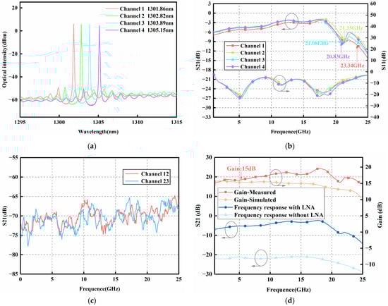 (a) Wavelengths of four channels, (b) transmission loss and return loss, (c) RF signal crosstalk between neighboring channels, and (d) test results of S21 and the measured and simulated gains.