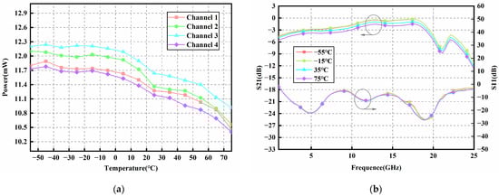The thermal stability of the module was experimentally validated over the specified ambient temperature range. As shown in Figure 15a, the power exhibits minimal variation with a deviation of approximately ±5% across the temperature range from −55 °C to 75 °C. The module’s bandwidth was tested at ambient temperatures of −55 °C, −15 °C, 35 °C, and 75 °C. Taking Channel 1 as an example, the results in Figure 15b demonstrate that the bandwidth exhibits minimal variation. In summary, the module demonstrates stable operation across the −55 °C to 75 °C temperature range, showing general agreement with simulation results. Although manufacturing tolerances and other non-ideal factors cause some performance degradation in experimental measurements, the module still meets application requirements.