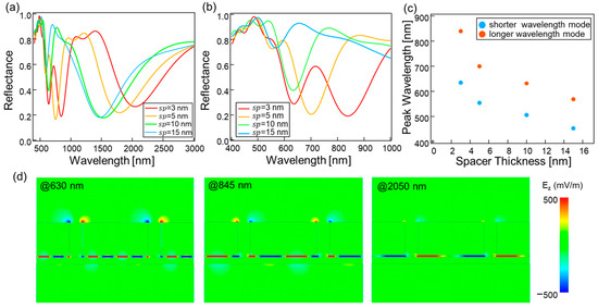 In the preceding section, we demonstrated that the presence of the silver thin film resulted in resonance peak sharpening through its interaction with the nanocube structures, facilitating resonance wavelength control within the visible light range. To gain deeper insight into the interaction between the silver thin film and the nanocube structures, we varied the distance between them and examined the resulting resonance modes in the x-z cross-section at the center of the structure. In a typical MIM structure utilizing Fabry–Pérot resonance, the resonance peak blueshifts as the spacer layer thickness decreases, following the Fabry–Pérot condition in the dielectric layer. On the other hand, in the case of the coupling mode between the localized electric field of a metallic nanostructure and its mirror image mode on the metal substrate, the resonance peak splits. As the spacer layer thickness decreases, the shorter-wavelength peak undergoes a blueshift, while the longer-wavelength peak experiences a redshift, enabling resonance wavelength tuning over a broad spectral range. Figure 3a exhibits the reflectance spectra with , , , and fixed at 100 nm, 50 nm, 20 nm, and 10 nm, respectively, while was varied from 3 nm to 15 nm. Three peaks are observed: two within the visible wavelength range and one in the infrared region. To examine the resonance modes, reflectance spectra in the near-infrared range are also included. Although this range extends beyond the fitted wavelength region of silver’s dielectric function, the values of the dielectric function in the infrared region differ slightly from those of the Lorentz–Drude model. As a result, the peak position and sharpness are slightly different; however, the overall trend of the peaks and the types of resonance modes remain unchanged. This is because, in the near-infrared region, the dielectric function closely follows Drude-type behavior. Therefore, these minor discrepancies do not affect the validity of the mode analysis. Figure 3b,c present the reflectance spectra with an expanded view of the visible wavelength range and the corresponding peak positions, respectively. All three resonance peaks exhibited redshifts as the spacer layer thickness decreased. Therefore, it can be concluded that these modes are distinct from Fabry–Pérot resonances or nanostructure–mirror image interactions. This redshift behavior suggests that, as the coupling between the nanocubes and the silver film becomes stronger with decreasing spacer thickness, spectral splitting into bonding and anti-bonding modes occurs. All three observed modes correspond to the bonding branches [44,45] resulting from this coupling. In this configuration, no blueshifted peaks corresponding to anti-bonding modes were found in the simulated spectra, indicating that the anti-bonding modes were not observed. The distributions of the electric field component in the z-direction at three resonance wavelengths for = 3 nm are shown in Figure 3d. In all modes, dipole oscillations of the nanocubes were identified, along with standing wave modes localized within the spacer layers. The longest wavelength mode observed in the infrared region corresponds to the fundamental mode, while the third- and fifth-order modes appear in the visible wavelength region [46,47]. These standing waves arose from the interaction between the dipole oscillations of the nanocubes and the silver film, which exhibited antisymmetric modes relative to the nanocube center. Consequently, even-order modes, which exhibited symmetry about the nanocube center, were not induced. Similarly to Fabry–Pérot resonances or nanostructure–mirror image interactions, the resonance wavelength can be controlled by adjusting the thickness of the spacer layer. The spacer thickness can be precisely controlled at the atomic scale via atomic layer deposition (ALD), enabling fine-tuning of the coupling strength. These findings indicate that even when the silver film is sufficiently thin to allow incident light transmission, optimizing the spacer layer thickness allows two modes in the visible region to be utilized for imaging applications.