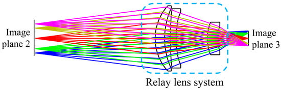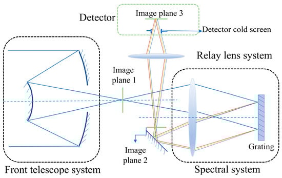 The slitless spectrometer consists of a front telescope group system, a beam splitting system, and a relay lens group system. The optical structure is schematically shown in Figure 1. The front telescope system is responsible for converging the parallel light rays from the target object into the incident beam of the system, providing the necessary optical focus for the whole spectrometer. The spectroscopic system is selected based on the Dyson modified spectrometer structure, which is responsible for the spectral dimension separation of the target. In addition, the system utilizes a secondary imaging design to achieve stray light suppression. Thus, a relay mirror system was designed to ensure that the cold diaphragm matching efficiency reached 100%.