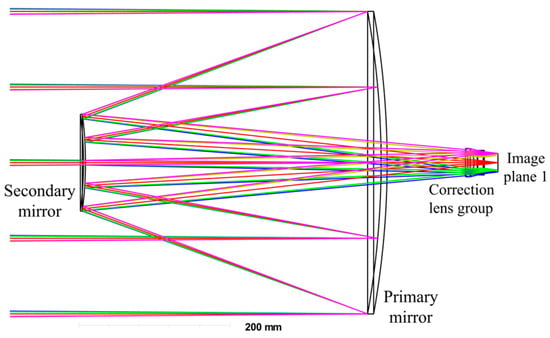 In the preliminary design, the relative aperture of the front telescope system was initially set to F/2 in order to satisfy the optical parameter matching. However, it was found that the RC telescope with this parameter configuration is more difficult to process in the actual design process, and therefore the relative aperture was adjusted to F/4. It is worth noting that since the actual field of view of the system exceeded the design range of the conventional RC telescope, this led to a significant degradation in the imaging quality. For this reason, a set of correction mirrors is introduced in this paper to effectively compensate for this aberration.