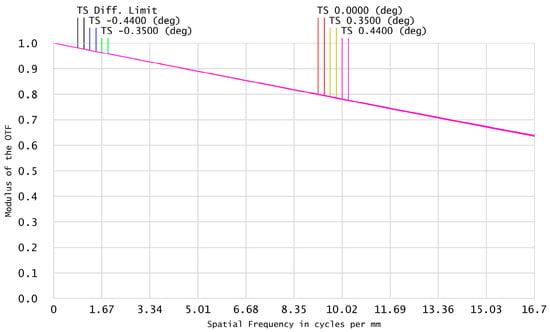 The optical structure schematic of the optimized front telescope system is shown in Figure 2, the MTF is shown in Figure 3, and the spot diagram is shown in Figure 4, from which it can be seen that the imaging quality of the front telescope system is excellent. In addition, the front telescope system successfully realizes the image-square telecentric design (i.e., the normal angle between the main ray of each field of view and image plane 1 is controlled within an extremely small range).