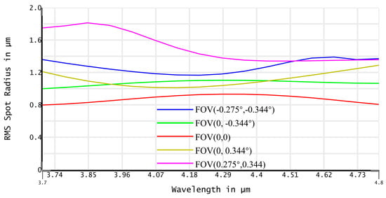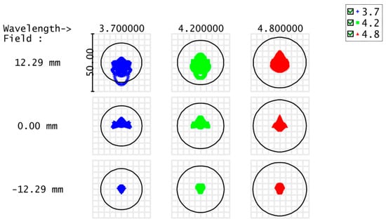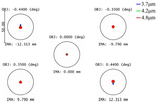 The spot diagrams of different wavelengths and fields of view of the spectrometer are shown in Figure 16, which shows that when the wavelength difference was 10 nm, the different wavelengths of the spectrometer’s center field of view and the edge field of view could still be effectively separated in the image plane, indicating that the spectral resolution of the spectrometer was better than 10 nm and the design requirements of the system were met.