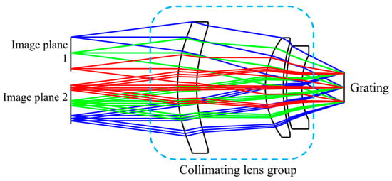 The system requires a spectral resolution better than 10 nm/pixel, and the magnification of the subsequent relay mirror system was designed to be −0.5. Thus, the spectral resolution was designed to be 9 nm/pixel, where µm and nm. t According to the above formulas, combined with the requirements of the separation of the image plane and the parameters of the primary image plane AB, the initial parameters of the spectroscopic system can be determined. The focal length of the lens group is mm, the eccentricity value is 25 mm, the grating size is mm, and the grating constant is lp/mm.