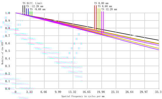 The schematic diagram of the final design of the optical system of the relay lens group is shown in Figure 9, and the MTF diagram is shown in Figure 10, which shows that the imaging quality of the relay lens group system was excellent. In addition, its exit pupil was located at −20.47 mm, and the diameter of the exit pupil was 10.235 mm, which coincided with the cold diaphragm of the detector, realizing 100% matching efficiency of the cold diaphragm.