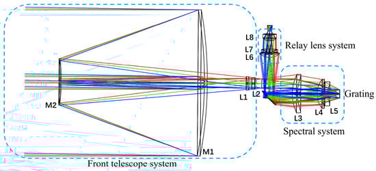 After the independent design of the front telescope system, spectroscopy system, and relay system were completed, these three subsystems needed to be combined and further optimized, especially in terms of the spectral smile and keystone. In addition to the collimating mirror set, aspherical lenses can be used to reduce the spectral smile and keystone. In this paper, this occurred after the combination of the system. Therefore, optical design software was used to optimize the whole optical system of the spectrometer, and the spectral smile and keystone were optimized by using the light position evaluation function’s operand. The total length of the final optimized spectrometer system was controlled at 767 mm, and the schematic diagram of the optical structure of the system is shown in Figure 11. The system performance indicators are shown in Table 1, and the main component parameters are shown in Table 2.