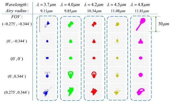 Spot diagrams under the different wavelengths and FOVs. The images in the figure are diffuse spots in different fields of view and wavelengths of the system, where the same columns have the same wavelength and the same rows have the same field of view.