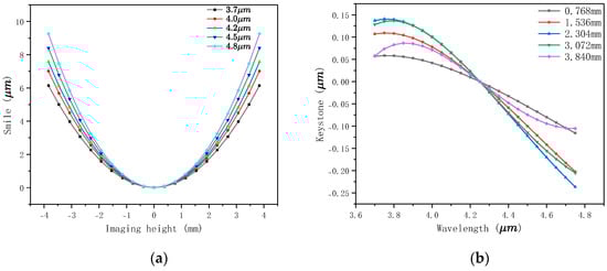 The variation curve of the system’s spectral smile with the image height is shown in Figure 14a, from which it can be seen that the spectral smile in the working band was always no more than 10 µm. The spectral smile increased with the increase in wavelength and field of view and was symmetric with respect to the center field of view. The variation curve of the system’s keystone with the wavelength is shown in Figure 14b. The keystone was always no more than 0.3 µm, and the spectral smile and keystone were both effectively controlled within one pixel size, which indicates that the optical performance of the system was not uniform. Both the spectral smile and keystone were effectively controlled within one image element size, indicating that the optical performance of the system met the expected design objectives.