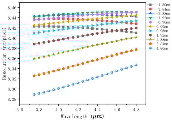 Using the above formula, and are taken as the shortest and longest working wavelengths of the slitless spectrometer, respectively. Optical design software was used to trace the light in different fields of view to find the total dispersion width of different fields of view, and then the spectral resolution was calculated. The variation in the spectral resolution with the wavelength is shown in Figure 15, from which it can be clearly seen that the difference in spectral resolution between different fields of view and different wavelengths was relatively small, and the dispersion of the spectrum basically presented a linear relationship, realizing the value of the spectrum, which provides a great advantage for the inversion of the subsequent data. The spectral resolution of the spectrometer was calculated as the mean value, and the result shows that the spectral resolution of the spectrometer was 8.41 nm/pixel, which is better than the design index requirement of 10 nm/pixel and meets the system design requirements.