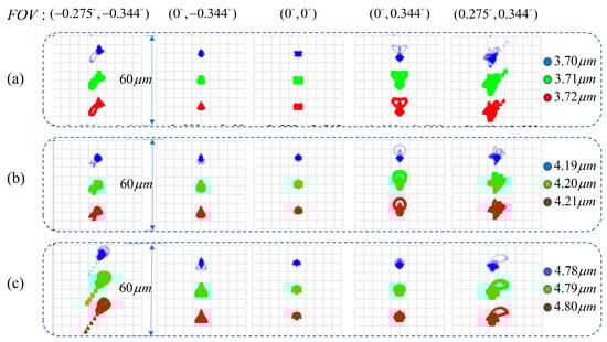 Spot diagrams under different bands and FOVs; (a) ; (b) ; and (c) . The plot is a column of dots spaced at wavelengths of 10 nm, with each column having the same field of view and each row having the same wavelength.