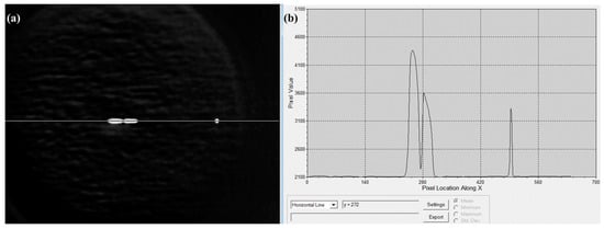Figure 18a displays the standard blackbody infrared spectral image acquired by this spectrometer, exhibiting excellent background uniformity that demonstrates its superior stray light suppression capability. The distinct white spot on the left side of the image in (a) corresponds to the blackbody’s zero-order diffraction spectrum, whose intensity distribution reflects the system’s point spread function characteristics. The two bright white lines on the right represent +first-order diffraction spectra, with their spectral broadening directly correlated to the system’s spectral resolution. These two spectral bands were located at and , spanning 78 pixels and yielding a spectral resolution of 8.58 nm/pixel, which shows close agreement with the design specifications.